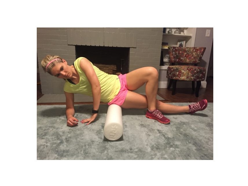 To effectively foam roll, we first have to identify the muscles and tendons to be treated. Then, apply a consistent pressure on the chosen tissues to obtain the release. Identification of the problem area may be done by using the rolling action of the foam roller. The “rolling” portion should be used more as a diagnostic tool to help find the area to be treated. Once identified, light-moderate sustained pressure can be applied to the area by remaining still and allowing your body to relax into the foam roller. In this way, the foam roller is providing static pressure on a specifically chosen area. An example demonstrating rolling of the glutes can be seen in the following image. Notice how she maintains two solid contacts with the ground (right forearm, left foot) to modulate how much pressure is applied to the back of the right hip.